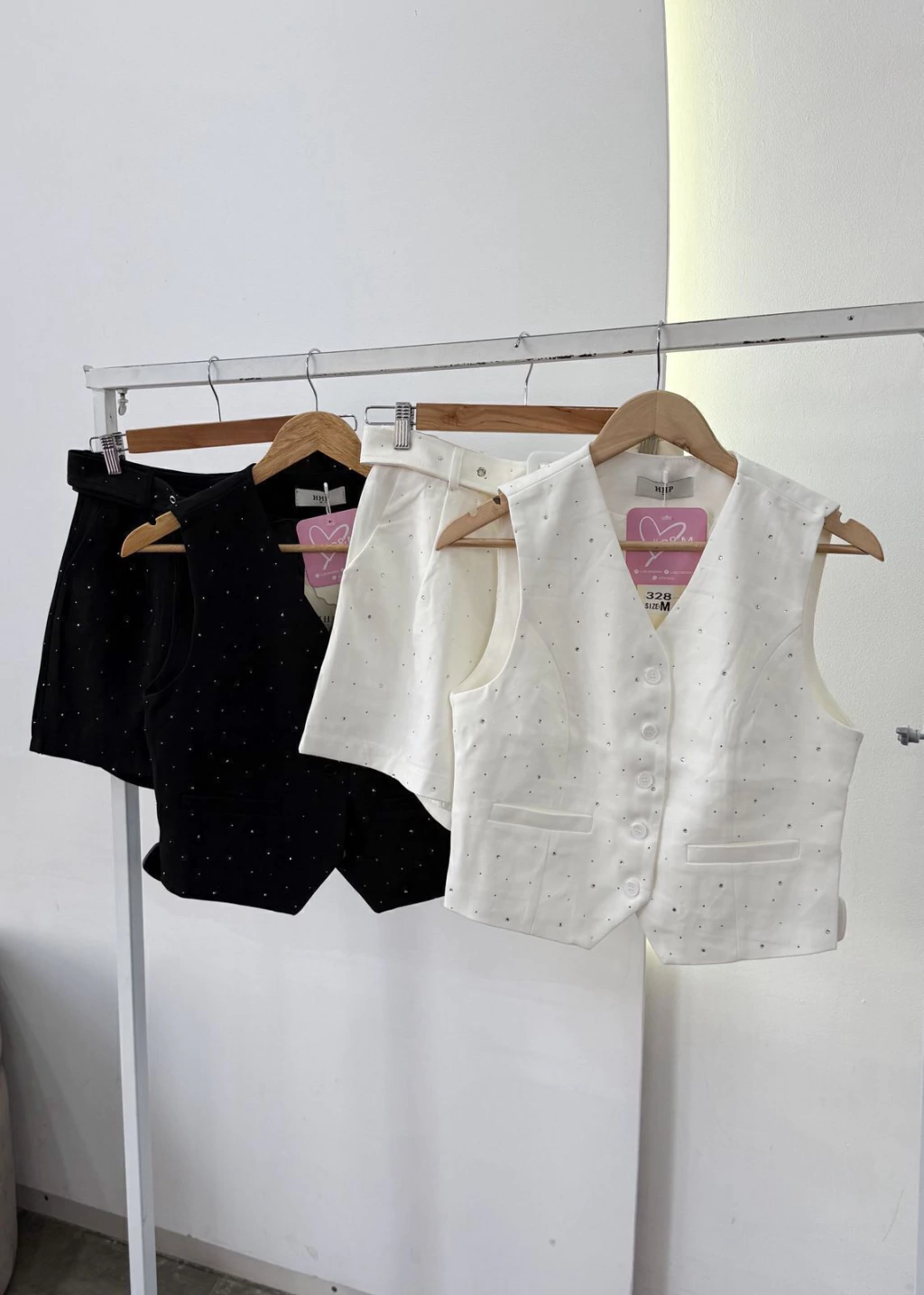 El detalle de strass en el chaleco aporta un toque sofisticado y luminoso, ideal para quienes buscan resaltar con elegancia en cualquier ocasión. El short complementa el conjunto con un diseño práctico y moderno, perfecto para combinar en diferentes outfits.